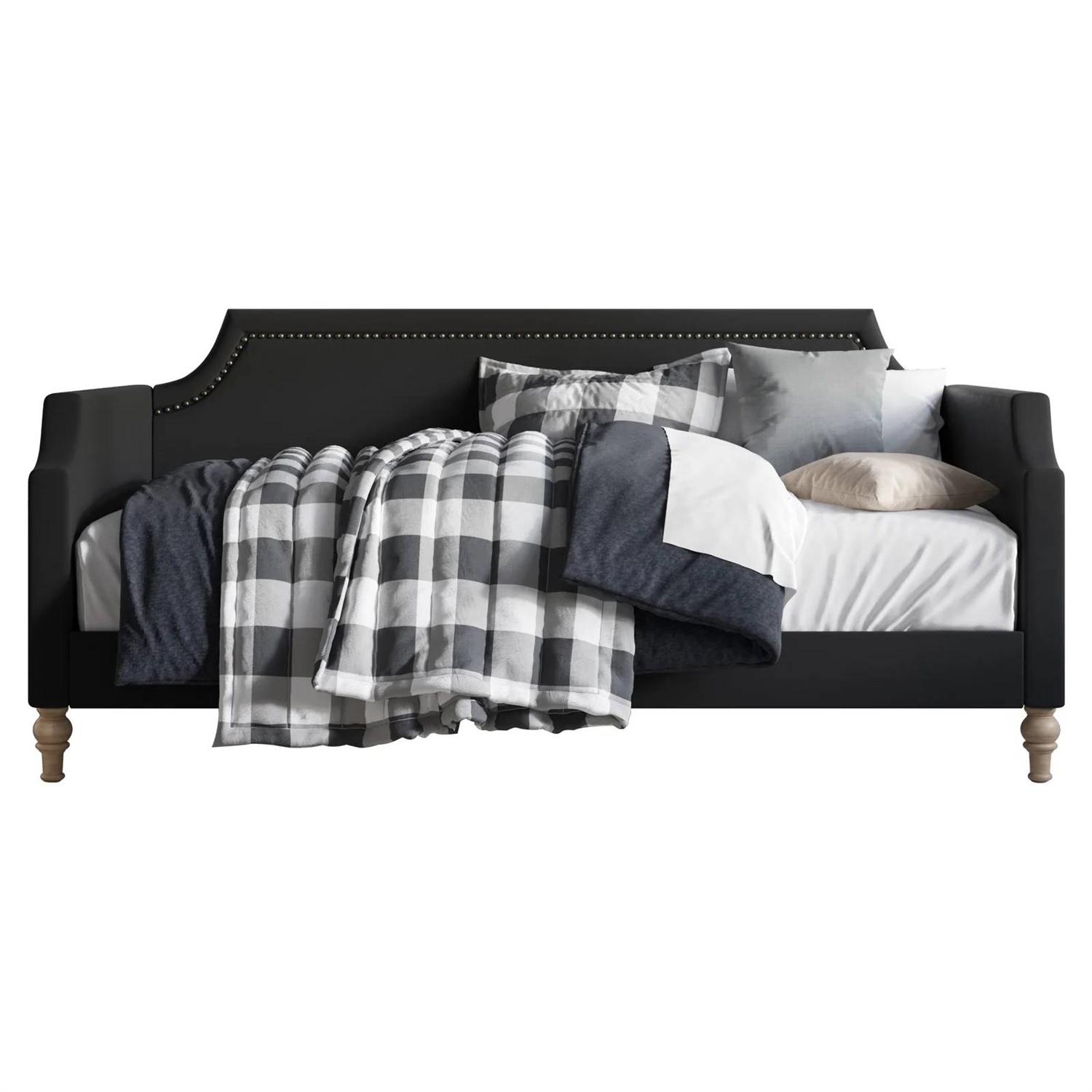 This Twin size Black Polyester Fabric Upholstered Daybed with Nailhead Trim gives you another spot to sleep, whether it's found a home in your guest room or in your main living area. It stands out thanks to its scooped silhouette on the back and sides, along with traditional turned detailing on its four corner legs. Made from solid and engineered wood, this Twin size Black Polyester Fabric Upholstered Daybed with Nailhead Trim is wrapped in a neutral-toned polyester fabric that blends in nicely with almost any style, color palette, or pattern. Nail head trim completes the overall look, and a slat kit provides ample support for a twin mattress (sold separately).