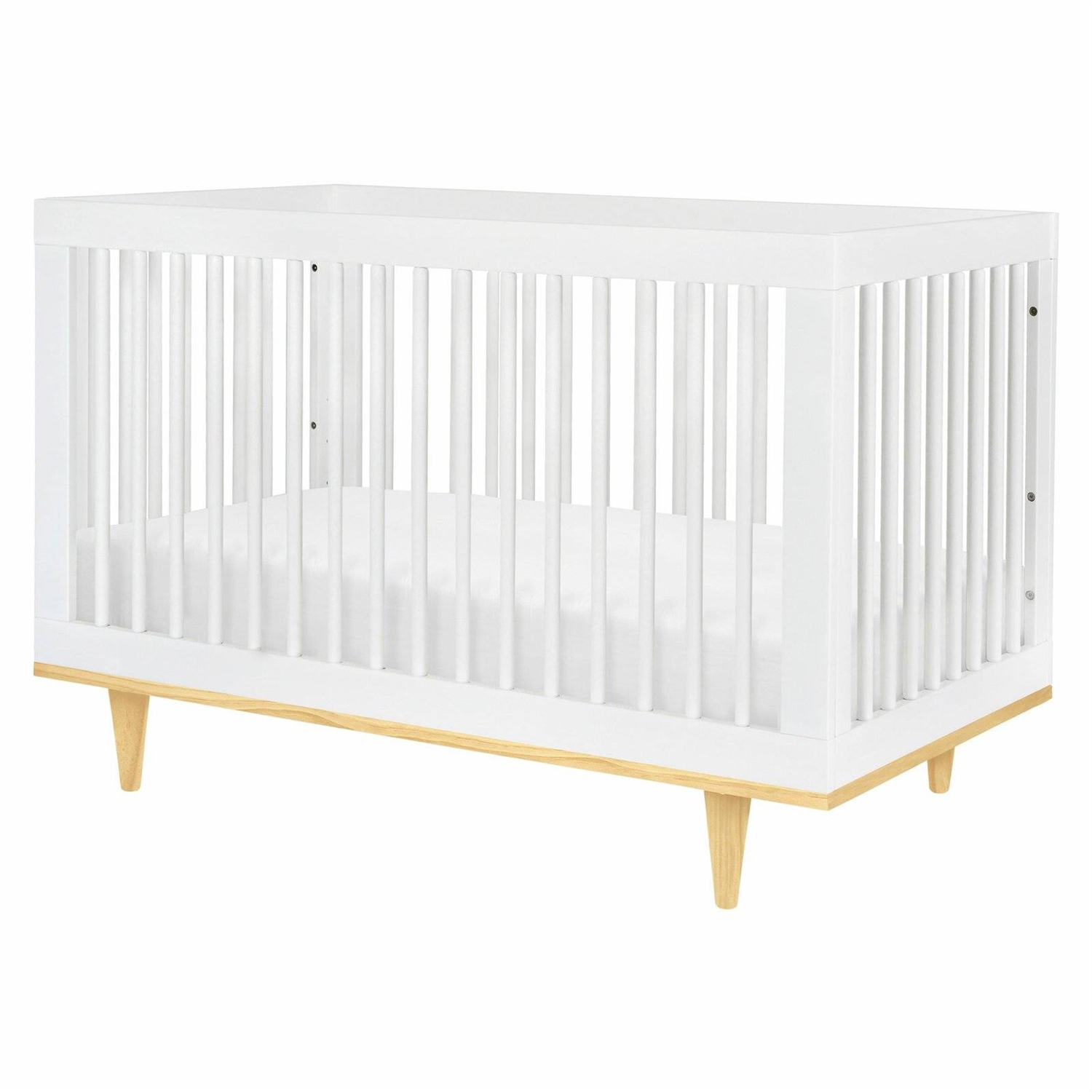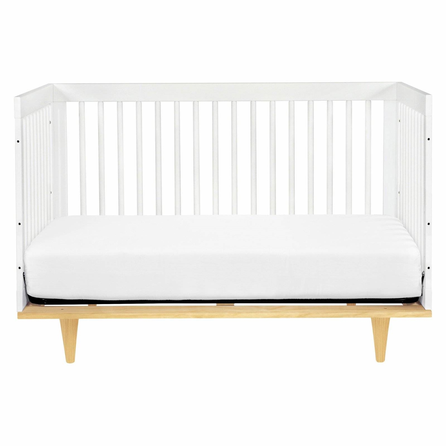 The 3-in-1 Modern Convertible Crib, with its clean lines, mid-century style legs, is the perfect contemporary crib for any modern nursery. Straight solid wood slats are designed to be sleek and simple, while two-tone white and natural color choices add flair and variety. This crib is built to last with convertibility from crib to toddler bed to daybed Stationary sides to keep your baby safe.