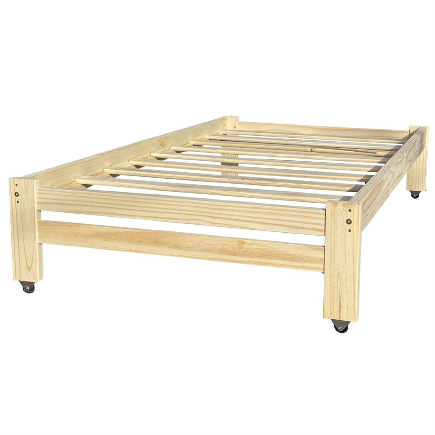 Twin size Platform Bed Frame on Casters. Minimalist design with no headboard or footboard. Great for college dorms, apartments, master bedroom, guest room, kids, teens, and adults. 350-lbs. max weight capacity. Bed rolls smoothly on 4 wheels. Wheels are removeable. Made from solid pine wood and hardwood slats. Unfinished wood bed. Ready to finish. Perfect for you wood painting project. You can varnish, paint or wax it. Or, just leave it unfinished. Each piece is sturdily built to last. Bed can be used for decades. With a simple and minimalist platform bed design, both boys and girls love this bed. Features hardwood slats to support your standard size mattress.. Mounting hardware, screws, slats and side rails are included. Philips screwdriver required (not included). Similar beds are sold at exclusive stores for more than double the price. Made with sustainable plantation grown wood with respect of the environment and wildlife. Quality furniture at affordable prices.