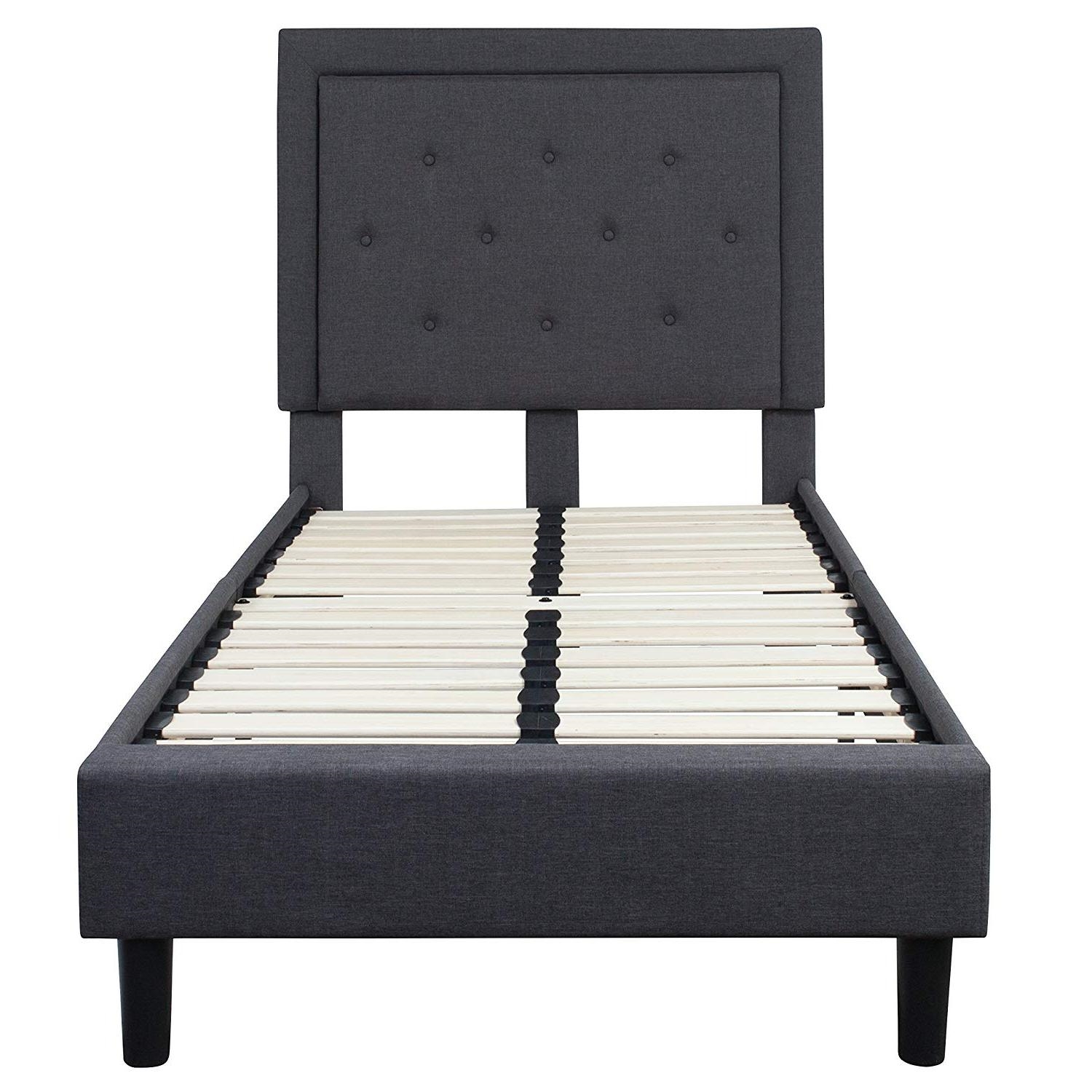 Retreat in style with this Twin Dark Gray Fabric Upholstered Platform Bed with Button Tufted Headboard. Platform beds are designed to give your room an open concept feel and are perfect for those who don't like high seated beds. One advantage is the soft panel headboard as well as the cushion like base. The headboard features gorgeous nail trimming and button tufted upholstery. The frame features 15 wood slats that are designed to support your mattress without the use of a box spring. Finally, a bedroom designed to give you a comforting and peaceful nights rest.