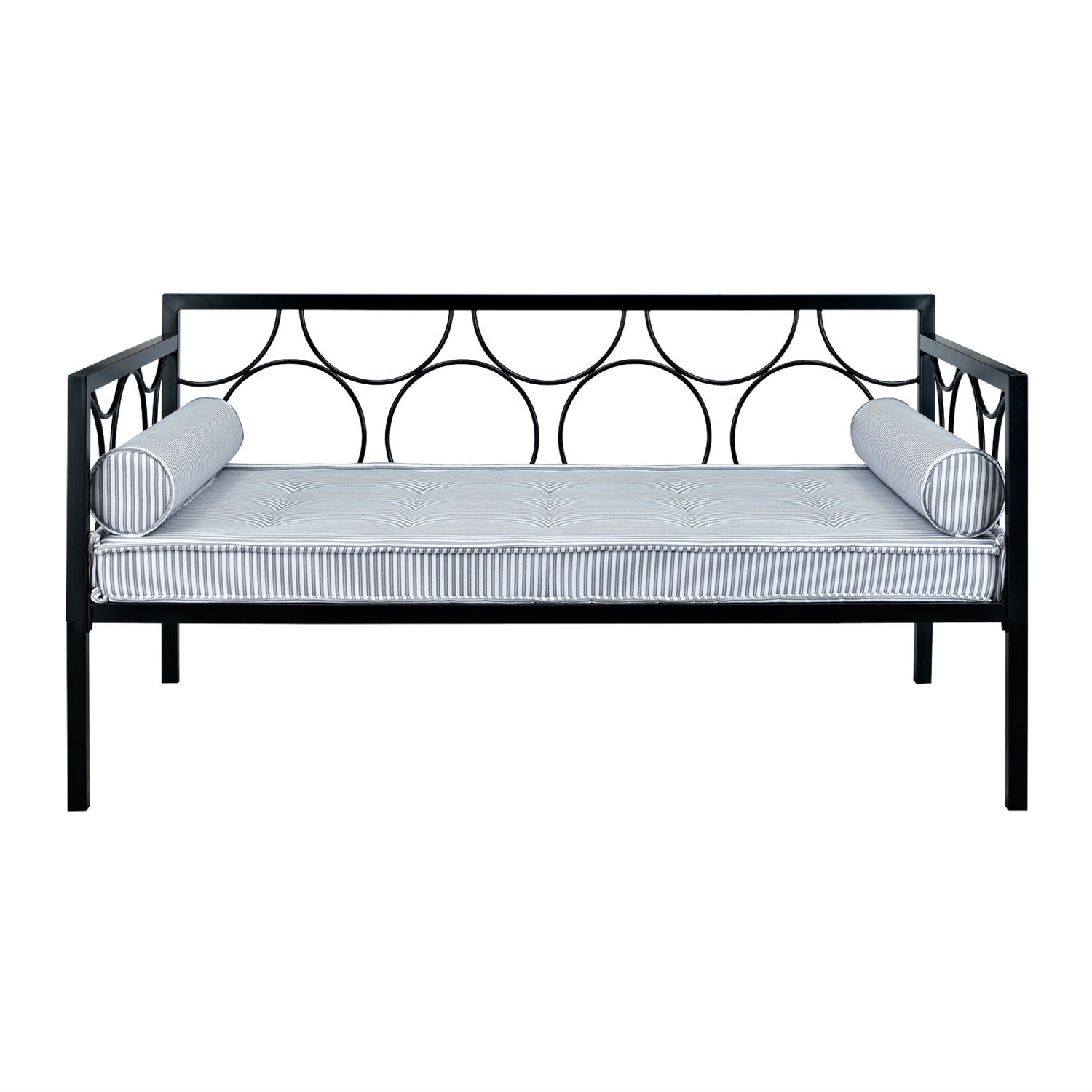 Create a comfortable and welcoming haven for your family and guests with this Twin size Modern Black Metal Daybeds - Use as Bed or Seating. The circular motifs and square tubes lend a contemporary look to any modern home. This versatile twin-size daybed offers extra seating and sleeps one comfortably. The simplicity and tailored look of the Twin size Modern Black Metal Daybeds - Use as Bed or Seating is sure to create hospitality in your home!