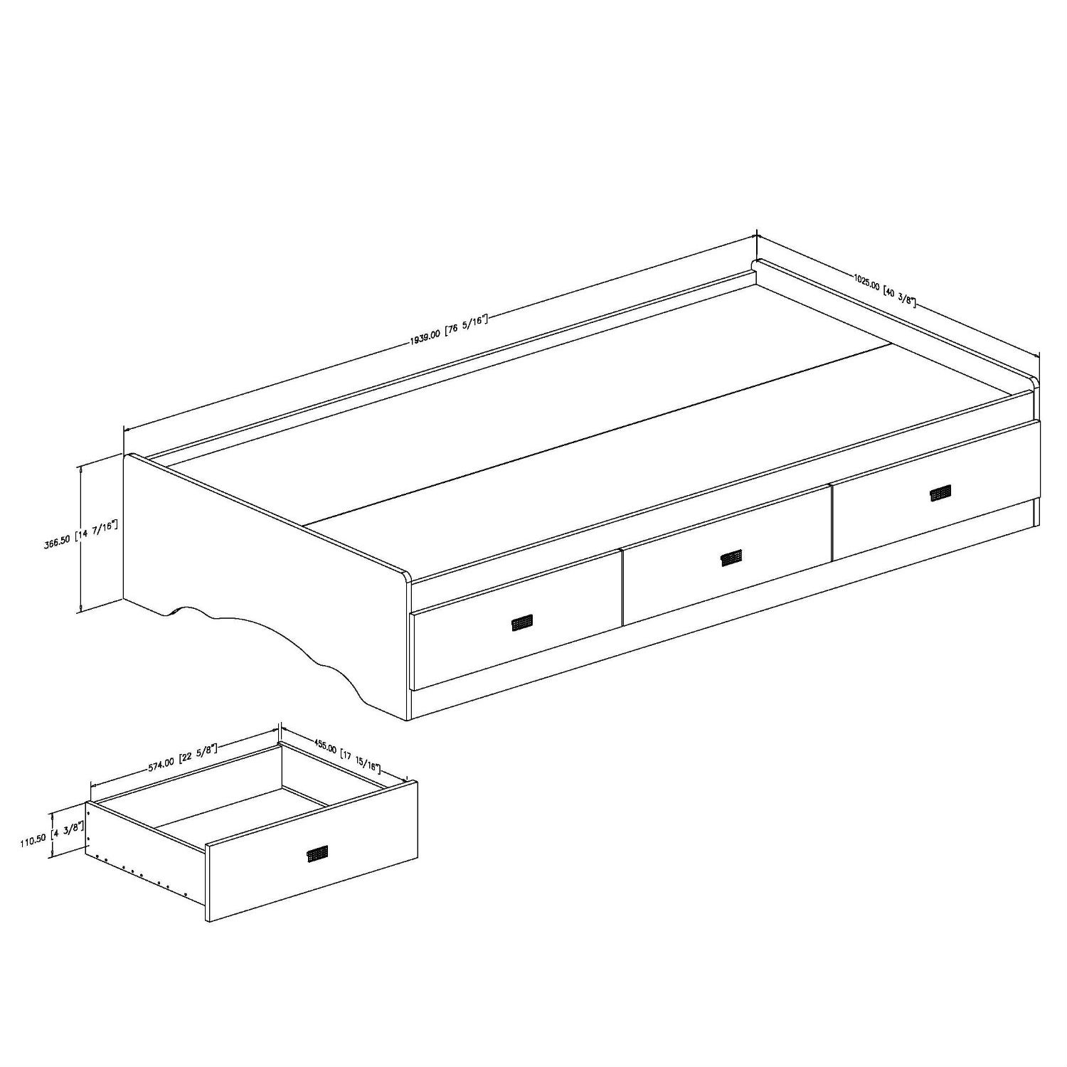 With its three drawers, this Twin size White Platform Bed Frame with 3 Storage Drawers is a great space-saving solution. Girls will love its jewel like chrome handles and decorative cut-outs. It can also be attached to the matching Twin 39-inch headboard for even more storage options (Headboard not included). It is equipped with polymer glides that include dampers and catches for enhanced safety. Its weight capacity is 250-pound and no box spring is required. Bed is reversible therefore drawers can be placed on either side of the bed. The interior drawer dimensions are 22-1/2-inch wide by 17-3/4-inch front to back. It measures 76-1/4-inch long by 40-1/4-inch wide by 14-1/2-inch high. It is delivered in a box measuring 85-inch by 23-1/2-inch by 4-1/2-inch and weighs 126-pound. Made of non-toxic recycled CARB2 compliant laminated particle panels. Complete assembly required by 2 adults. Tools are not included. 5-year limited warranty. Made in Canada.
